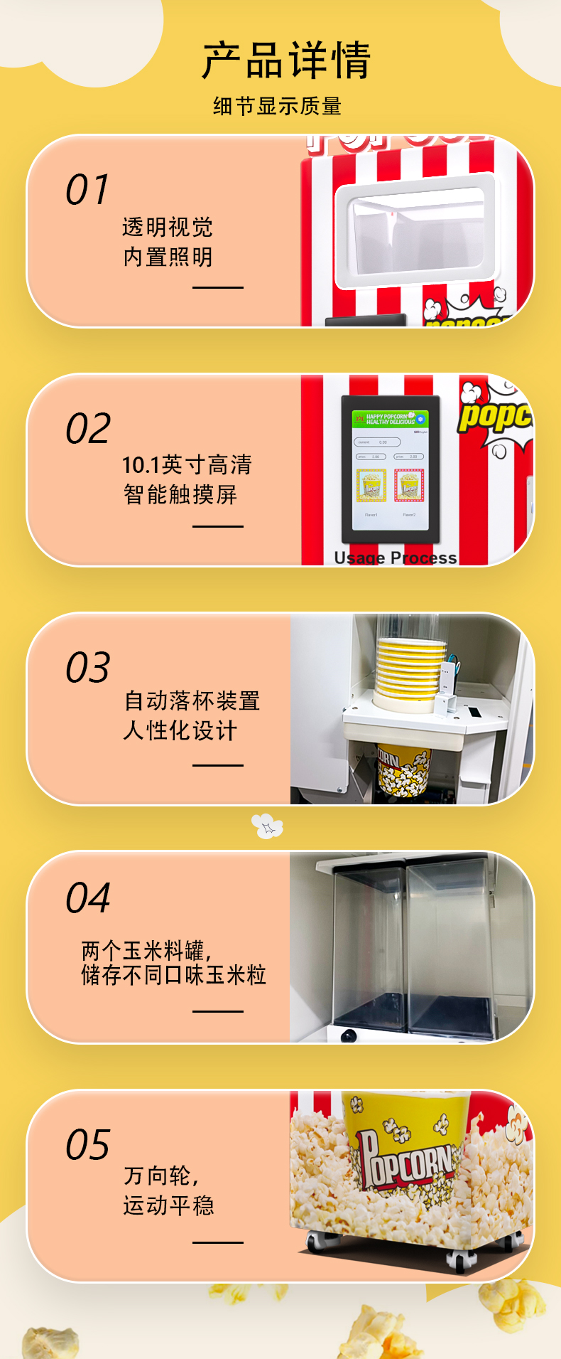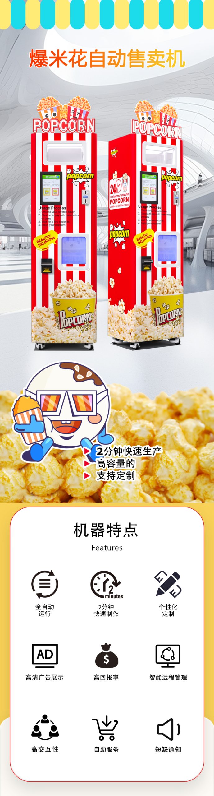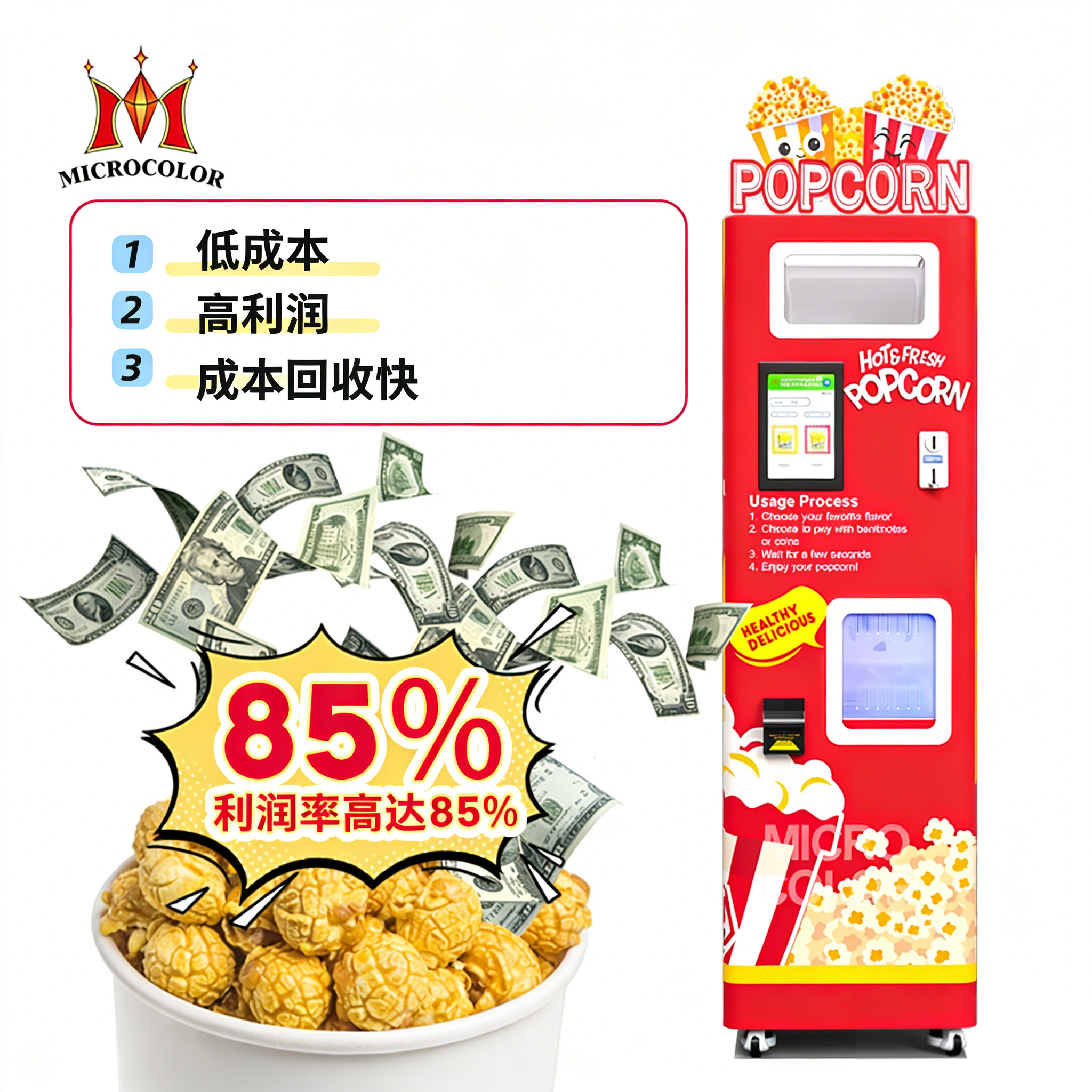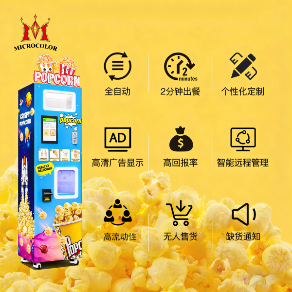 广州市微彩智能科技有限公司的智能爆米花自动售货机只需2分钟即可提供新鲜酥脆的爆米花,口味可定制(原味/甜味/咸味)。采用紧凑的自助式设计,配备10.1英寸触摸屏,支持多种支付方式(硬币、现金、银行卡)。该机搭载物联网技术,可进行实时监控和警报,确保低维护成本和高效率。机器采用食品级材料,安全卫生,节能环保,并具备过热保护功能。它是电影院、商场、学校等场所的理想之选,可实现高利润和低运营成本。可定制的品牌形象和快速的投资回报使其成为寻求新收入来源的创业或企业的完美选择。
