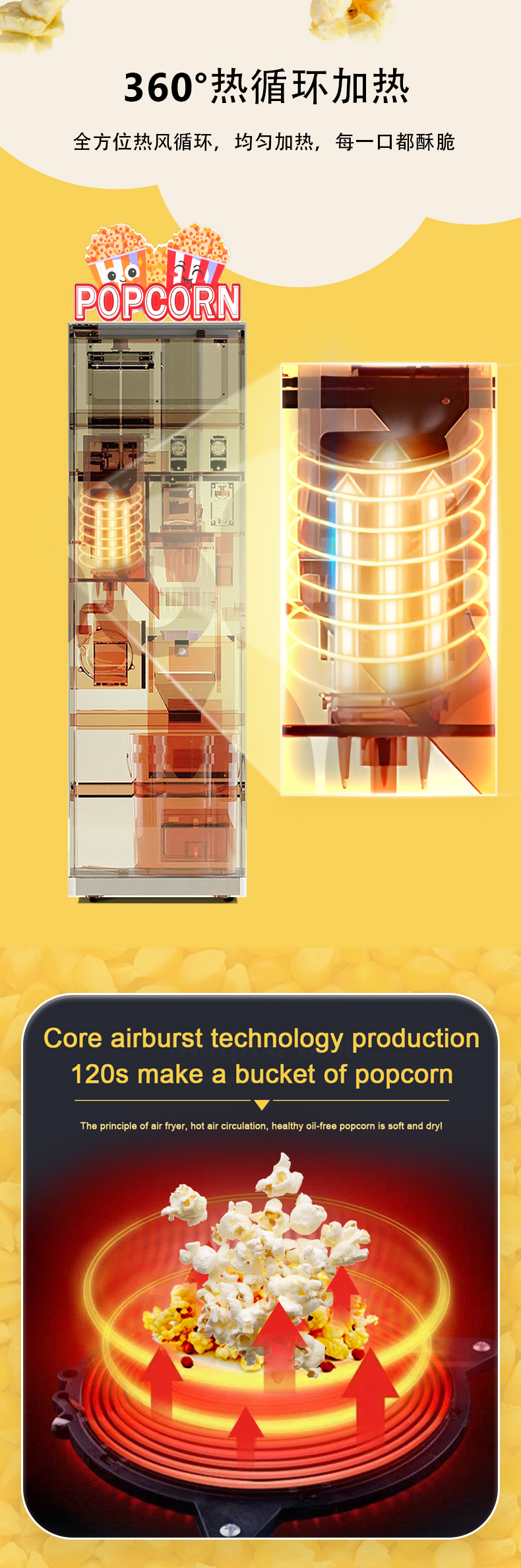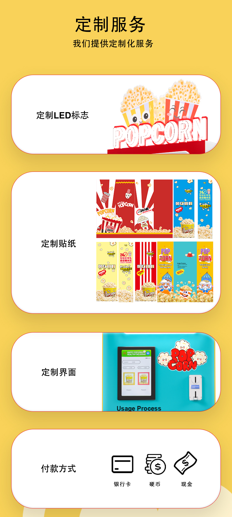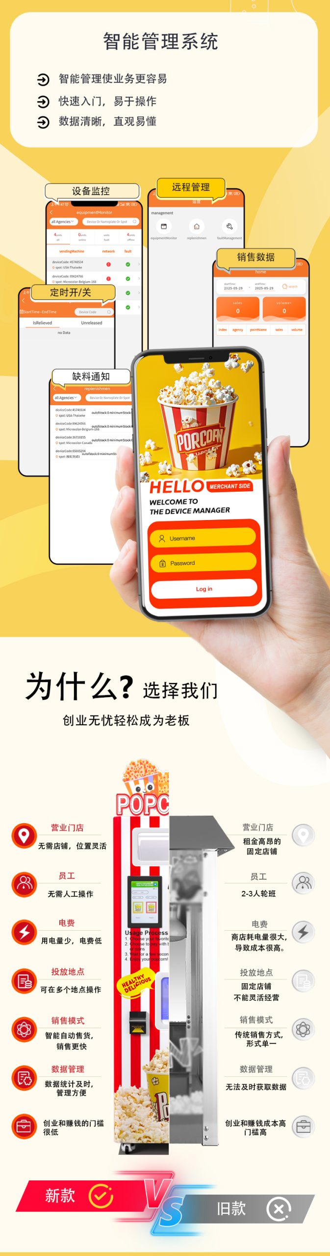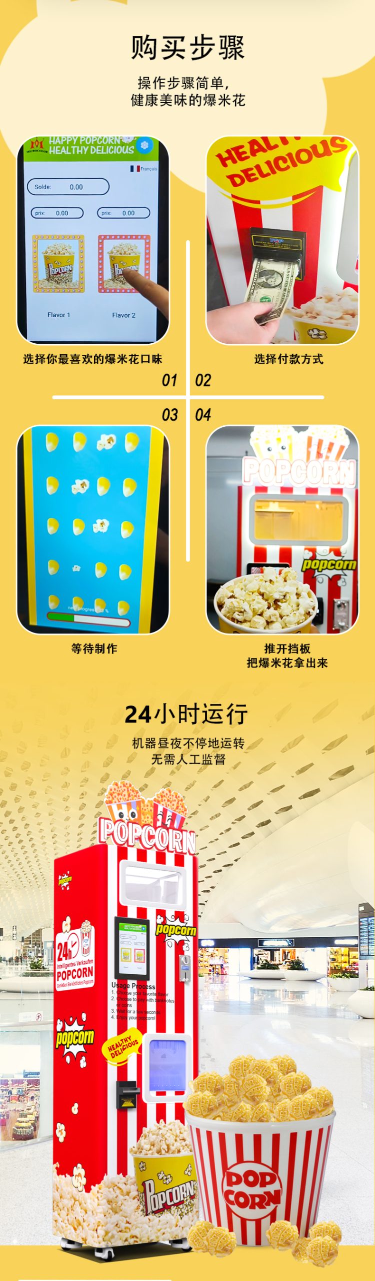 广州市微彩智能科技有限公司的智能爆米花自动售货机只需2分钟即可提供新鲜酥脆的爆米花,口味可定制(原味/甜味/咸味)。采用紧凑的自助式设计,配备10.1英寸触摸屏,支持多种支付方式(硬币、现金、银行卡)。该机搭载物联网技术,可进行实时监控和警报,确保低维护成本和高效率。机器采用食品级材料,安全卫生,节能环保,并具备过热保护功能。它是电影院、商场、学校等场所的理想之选,可实现高利润和低运营成本。可定制的品牌形象和快速的投资回报使其成为寻求新收入来源的创业或企业的完美选择。